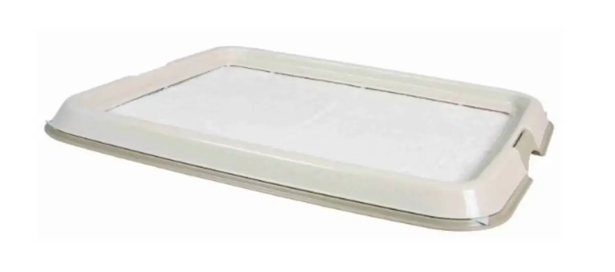 - Plaats de kunststof bak en leg onderaan een absorberende laag (grind, kattenbakvulling of trainingspad).